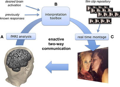 Diagram of the enactive setting: (A) the viewer’s physiological responses are analyzed in real-time, (B) an “interpretation toolbox” compares them with previously known behaviors and selects cinematic elements that are expected to lead toward a desired response, (C) real-time montage produces continuous cinematic stimulus projected back to the participant, whose brain responses are scanned (A), and so on.